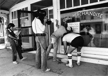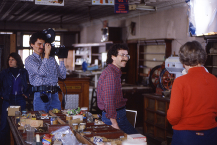 Ben Levin suggested two of his former students as crew members - Tom Ott as cameraman and Jan Krawitz as soundperson. They proved to be an excellent choice. As the sale was a complicated event we needed to add other members to our crew - additional camera work was handled by Wayne Paull and Arthur Goodell while Richard Stobach and Rhonda Richards served as additional sound people. Bruce Litecky doubled ad a sound person and did the lighting of the interior of the store. We used Francis Cox, a still photographer, to cover the sale. Finally we hired Jonathan Mertz as security.