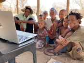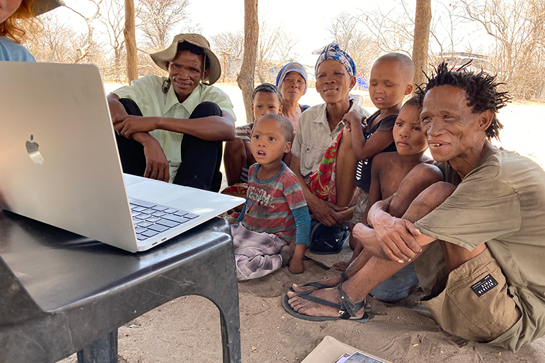 Laptop film screening for N!amace and family in Nyae Nyae. Photo: Frank Aveni
