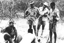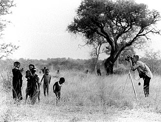 | JM | Oh yes. That really changed, to my mind, the whole concept of documentary filming because then you really had to listen to people. And what they said was often more important than what they were doing. And they said what they were thinking, how they were coping with the situation that they were in and when you began to have to, so to speak, have to listen as well as watch, you began to —people became more persons in the film instead of subjects of ethnographic interest from a distance. Suddenly they became persons. And that's when you could really do what I call shoot in an event, which means the angles and distances are motivated by the people in the event. If I stand behind you and take a picture of me and I'm saying what I'm saying, and then I come around and take a picture of you listening, you don't have to see people on the same screen, but you know we're talking together. And being able to shoot in the event made me able to meet people —persons. ![]() Rouch and hunters on the trail
